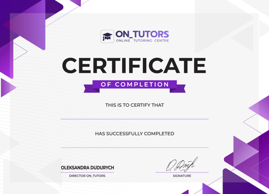 Отримайте сертифікат про завершення курсу англійської мови після успішного проходження програми. В сертифікаті буде вказано досягнутий рівень володіння мовою, підпис керівника організації, що проводила навчання. Для отримання сертифікату учасник відвідує всі заняття та проходить екзаменаційне тестування в кінці курсу. Сертифікат засвідчує, що студент завершив курс та досягнув певного рівня англійській мови. Онлайн курси англійської мови з сертифікатом спонукають до систематичного навчання і слугують кращим підтвердженням ваших зусиль. Наші студенти використовують сертифікат під час пошуку роботи чи здобуття подальшої освіти.